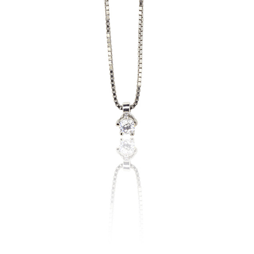 Collar está elaborado en plata de ley 925 con una circonita central engastada en garra, diseñada para realzar su brillo y aportar un toque de luz elegante y discreto. La cadena fina de plata completa el diseño, creando una pieza equilibrada y delicada.